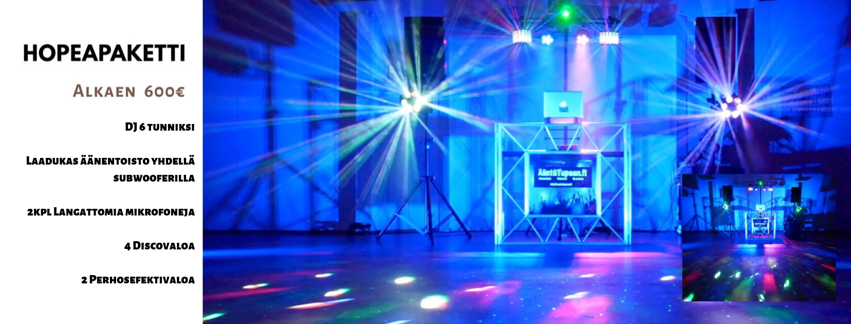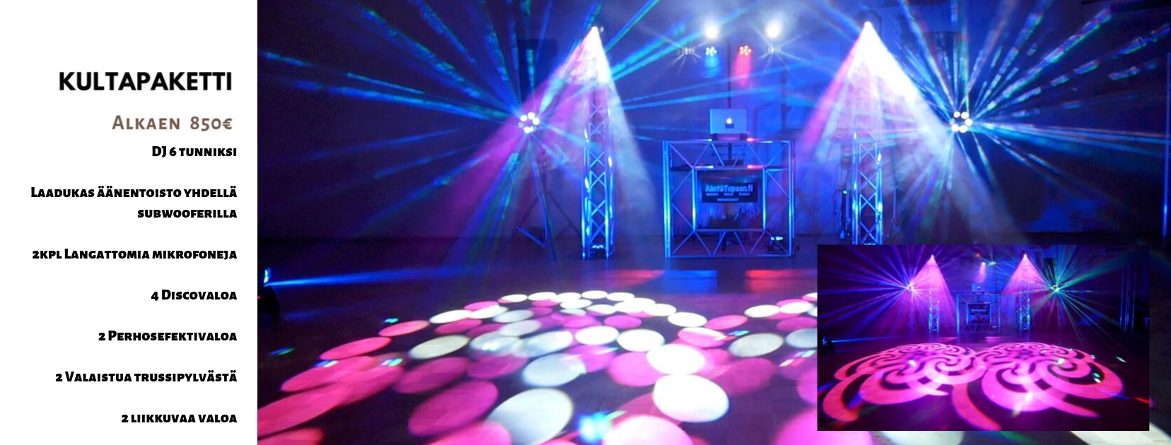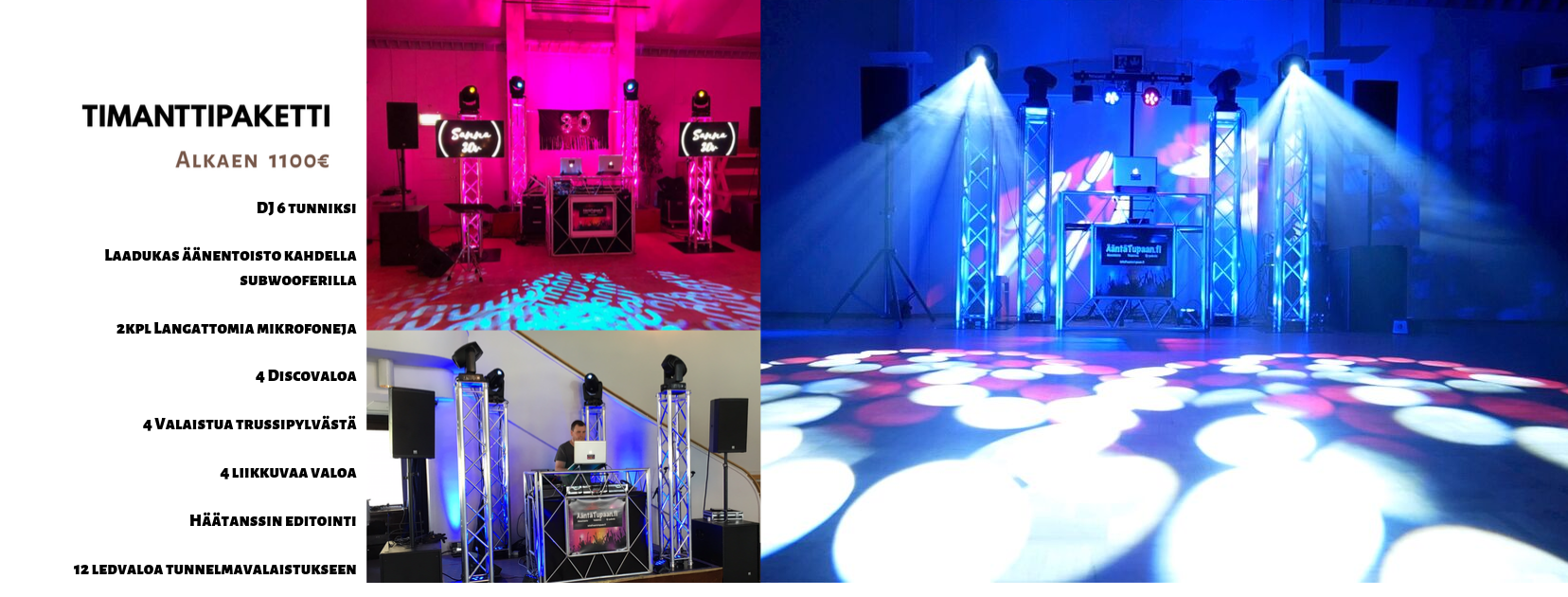 • Tunnelmavalaistus DJ-pakettien yhteydessä alkaen 4ledvaloa 50euroa sisältäen asennuksen.